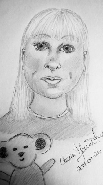 Eftersom vi ännu inte har fått någon klarhet i vem denna lilla flickan är, så lägger jag nu ut ett andeporträtt på henne, för att se om det finns någon som eventuellt kan känna igen henne och ta henne till sig, som en nära anhörig eller släkting som gått bort. Flickan är i 5-6 års ålder och bär omkring på sin älskade nalle, hon har ljust rakt hår med hel lugg och är liten och späd. Hon hade en vit spetsklänning med puffärmar när hon kom den kursdagen men idag vill hon bli avtecknad med en rundhalsad tröja.