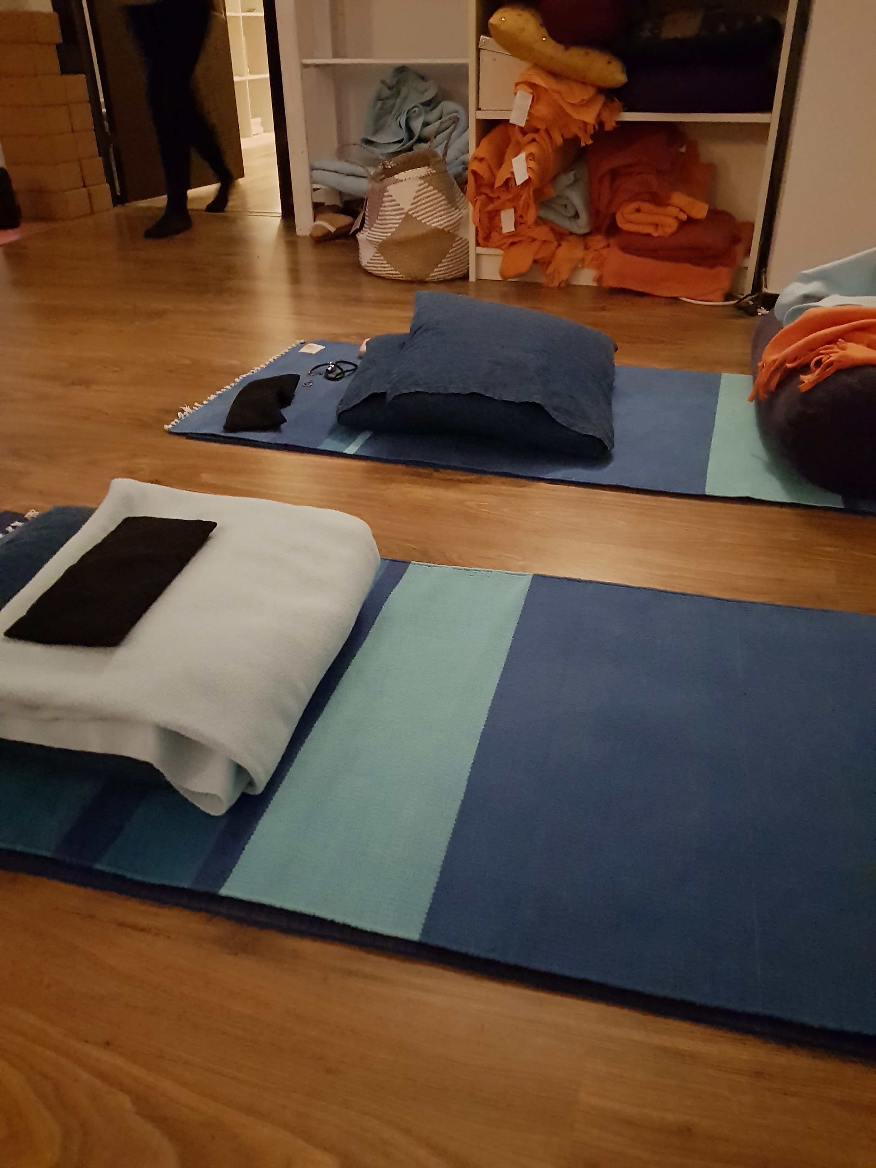 Man får en matta, en kudde, en filt, en kudde att ha under benen och en kudde att lägga på pannan, för att lättare kunna slappna av. En pirrande känsla infinner sig i kroppen inför vad jag skall uppleva då det är allra första gången jag gör något liknande. Jag lägger mig tillrätta och försöker att slappna av vilket blir lite svårt till en början då jag just nu bara funderar över vad jag kommer att uppleva. Men när Maria sänker belysningen i lokalen och allt höljs i ett dunkel av levande ljus, dofter och klangskålar, så infinner si´g min kropp i ett lugnare tillstånd och när Maria börjar tala med en lugn röst där hon förklarar att vi skall ta ett djupt andetag och bara låta kroppen slappna av och släppa alla tankar så känner jag min egen kropp landa på mattan.