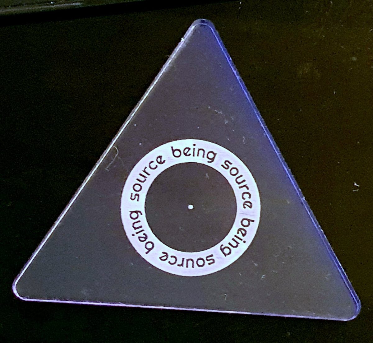 Under dessa fantastiska dagar har jag lärt mig mer om mig själv än jag gjort på länge och det har varit fantastiskt roligt att ”se” med både stängda ögon och med intuitionen och framför allt hjärtat. Det började med att jag hade en ”bild” som poppade upp helt plötsligt under en meditation sittandes, där det sakteliga växte fram en ”syn” av en triangel med ett slags nyckelhål inuti och en ring utanpå eller runtomkring den här triangeln. Färgerna som den bestod utav i min ”syn” var turkos och lila och det riktigt sprakade av dessa färger som flödade framför mina stängda ögon. Det första jag tänkte var att den här symbolen måste vara viktig för mig på något sätt, då jag vanligtvis bara brukar få det som har med mitt arbete att göra sedan några rå tillbaka då Magdalini energin först kom till mig i sprakande guldfärg. Och under kursdagen visar Mikael Säflund oss alla vad han har m ed sig i en liten väska – en Triangel.