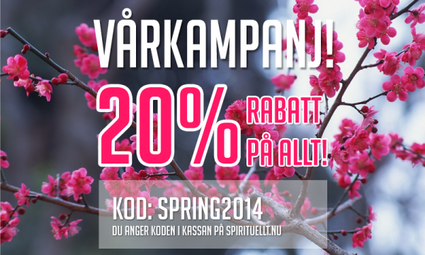 Spirituellt.nu har vårkampanj! Nu när våren är här och solen skiner, så vill vi på Spirituellt erbjuda dig 20% rabatt på hela vårt sortiment i butiken! Observera: Kampanjen gäller enbart mellan 16 April och 30 April! Hur gör jag för att nyttja rabattkoden? Lägg dina varor eller tjänster i varukorgen Gå till din varukorg Skriv […]