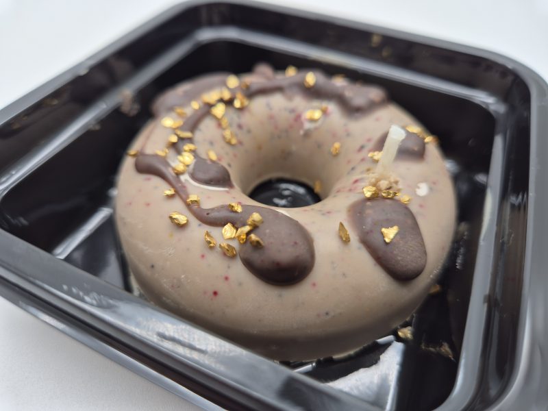 Fantasiska sojavaxljus, Här en Donut med chokladsås och guldglitter, som doftar karamell och kaffe.