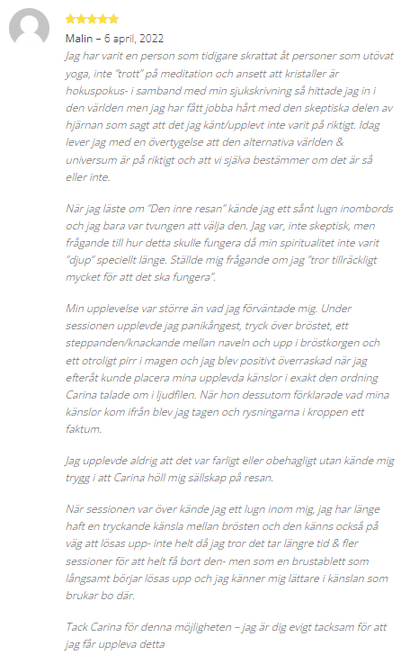 Carina Hammarsten är Reiki Master, Regressionsterapeut & diplomerat medium. Driver CH Spirituellt och anordnar med jämna mellanrum kurser, event och annat inom den andliga och spirituella världen.