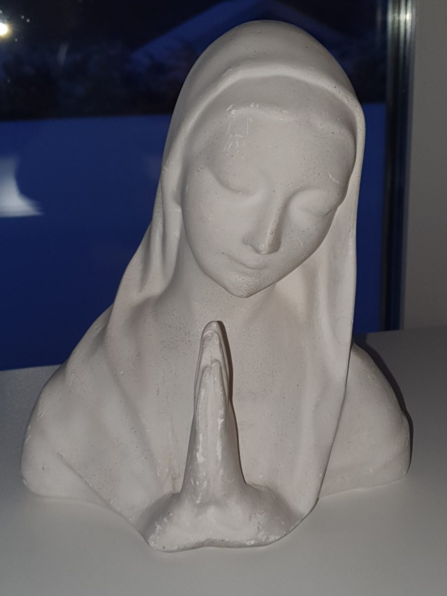 Jag klickar och det tar några sekunder innan samtalet kommer fram och jag kopplas samman med kunden. Och under den tiden så är det som att någon lyfter bort ovandelen av mitt huvud och hela taket börjar vibrera i fantastiska färger och till höger om mig tonar ljusblå och ljusgrön energi upp sig och ur dessa vibrerande färger växer Maria Magdalena fram med ett enormt ansikte svept med blå sjal på huvudet.